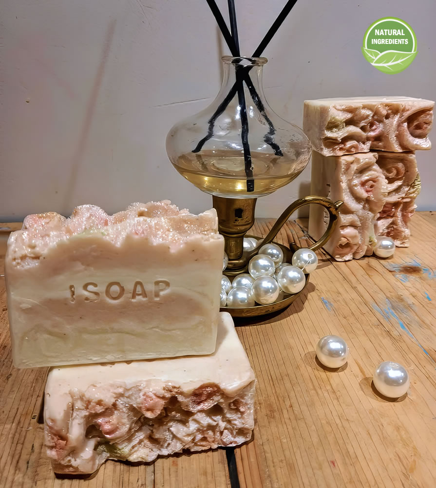 Pink clay, which is part of the soap, smoothes small wrinkles, softens, tightens the face, has a rejuvenating effect. Nourishes and cleanses the skin, making it softer and more elastic. Relieves fatigue and irritation. Improves blood circulation.
